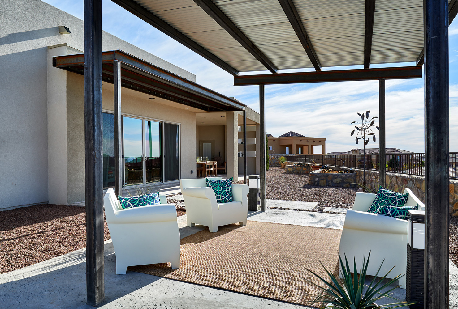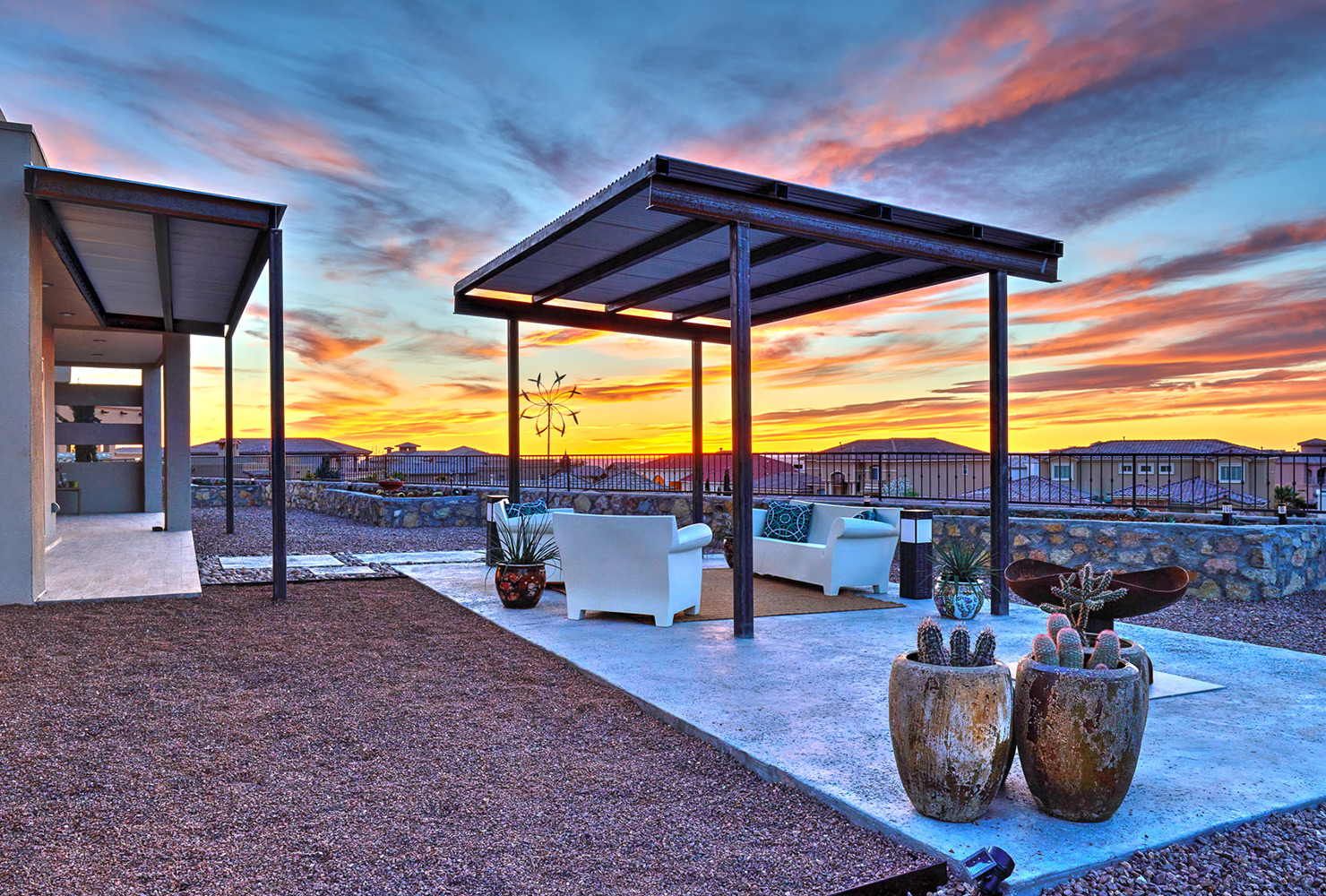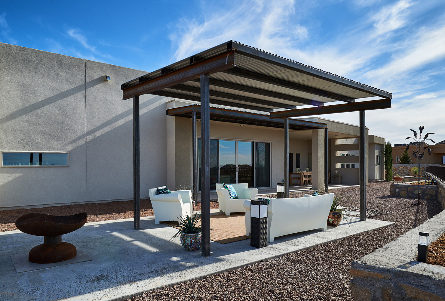 Minimal, contemporary shade structures and landscaping that reflect the client's love of international architecture and art. 2016.