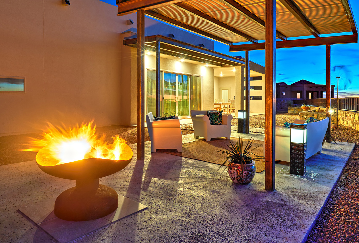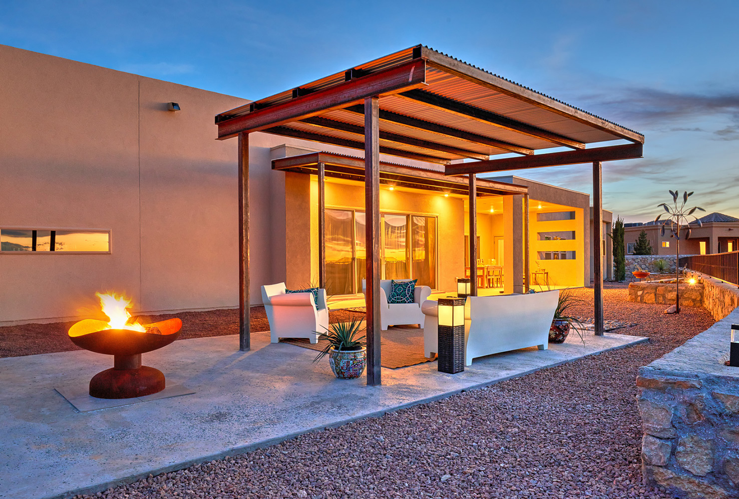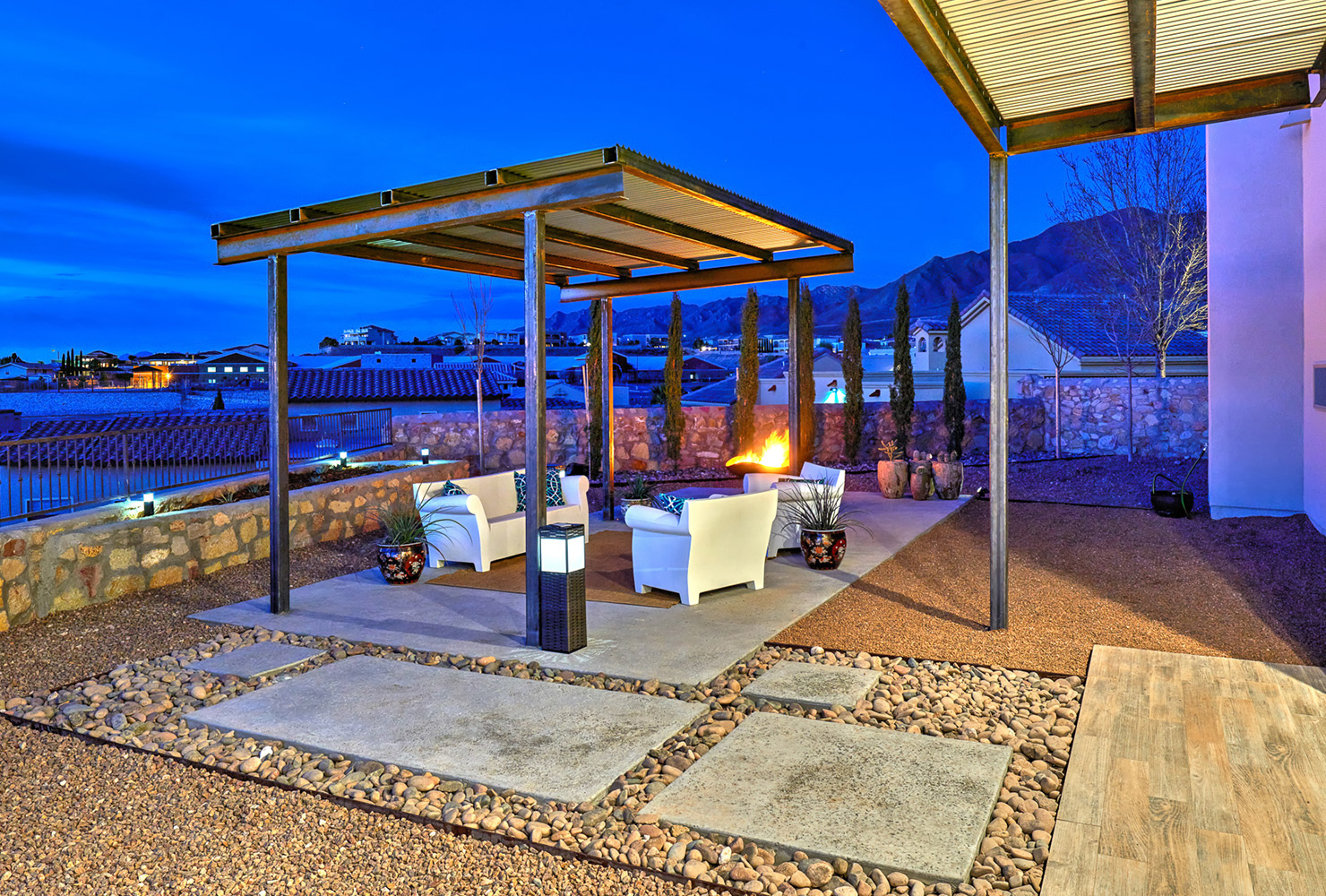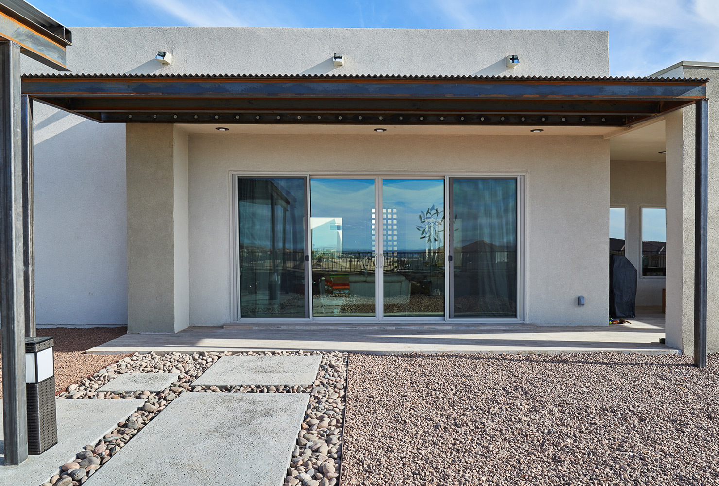 Minimal, contemporary shade structures and landscaping that reflect the client's love of international architecture and art. 2016.